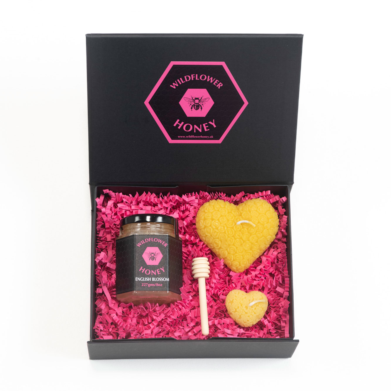 This thoughtfully assembled English Blossom Honey & Rose Heart Candles Gift Set is a celebration of the bees and the British wildflowers, providing a delicious treat and a beautiful, natural keepsake.